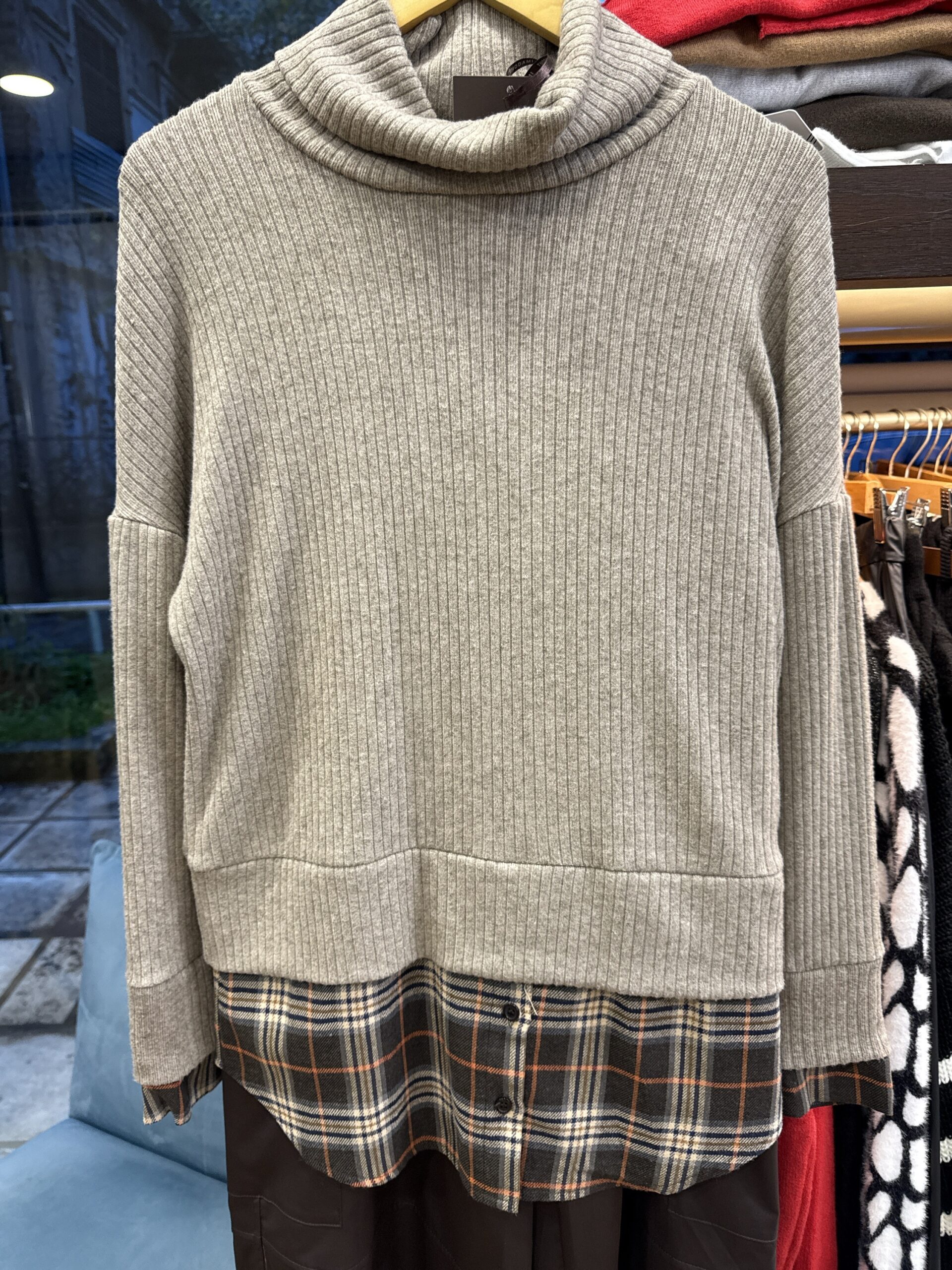 Μπλούζα με ξεχειλωτο γιακά μπεζ κ εσωτερικό πουκάμισο καρό,one size.